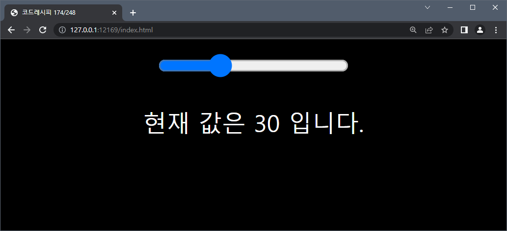 value 속성에 숫자를 대입하여 값을 변경할 수 있으며,화면의 슬라이더 바가 변경된 값에 따라 변경된다.