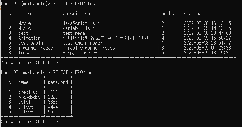예시 에서는 `topic`이라는 테이블과 `user`라는 테이블을 생성했다.