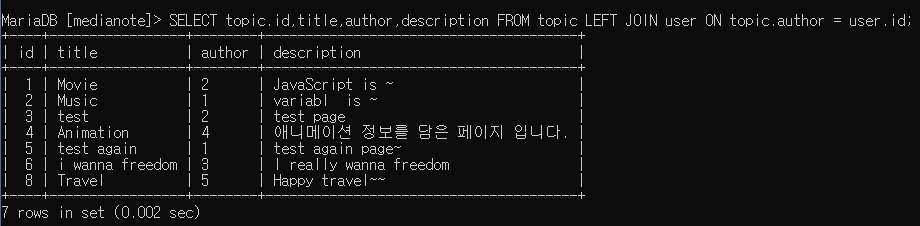 SELECT topic.id,title,author,description FROM topic LEFT JOIN user ON topic.author = user.id WHERE id=1;