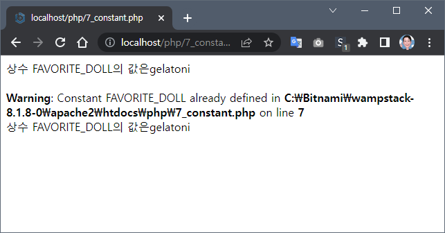 위의 예제에서는 상수 FAVORITE_DOLL 값에 이미 gelatoni라는 값이 대입되어 있으므로 다음에 대입한 duffy 값은 대입되지 않아 처음 대입된 값인 gelatoni가 출력되고 아래의 echo 문장은 에러메시지를 출력한다.
