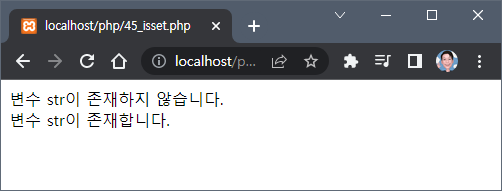 변수 str을 선언후 작성된 두번째 if문에서는 isset() 함수에서는 존재를 확인하고 true 조건에 부합하는 실행문이 출력됐다.