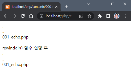echo "<br>rewinddir() 함수 실행 후<br>";