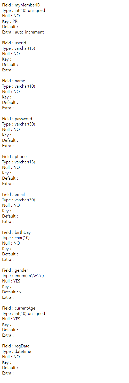 앞에서 언급한 DESC 명령어의 데이터를 웹페이지에 출력하는 방법에 대해 알아보자.
