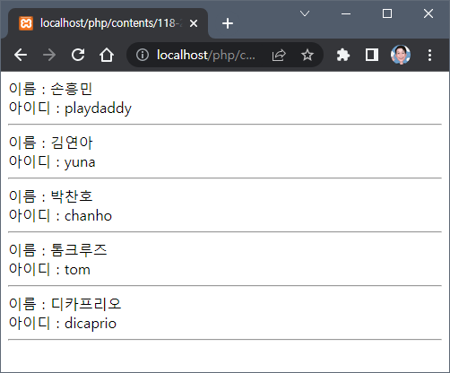 위의 쿼리문만으로 phpMyAdmin 또는 터미널에서 MySQL에 접속하여 이용하면 데이터를 불러올 수 있지만 php와 연동하여 테이블의 데이터를 웹페이지에 출력하기 위해서는 fetch_array() 메소드를 사용해야 한다.