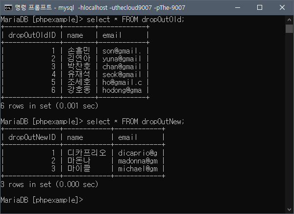 이제 dropOutOld 테이블에 레코드 6개, dropOutNew 테이블에 레코드 4개를 넣어보자.