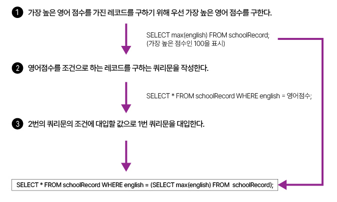 서브쿼리를 사용하여 가장 높은 영어 점수를 구한 후 그 점수를 조건문에 대입한다.