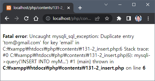 error_reporting을 on으로 해 놓은 경우 이미 존재하는 이메일 주소를 UNIQUE가 설정된 email 필드에 입력하려 했으므로 입력에 실패하게 된다.