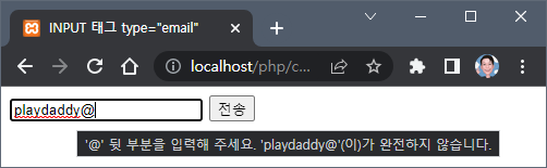 HTML5에서 새로 생긴 기능이며, 해당 폼에는 이메일 주소의 규칙인 @(at)과 도메인이 있어야 한다.