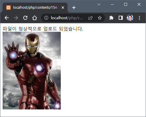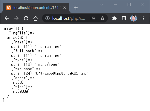 배열 $_FILE['imgFile']가 가지고 있는 정보를 보면 name 인덱스에 ironman.jpg 라는 업로드한 파일명이 존재하며, type 인덱스에는 image/jpeg가 존재한다. 이는 이미지 파일이고 확장자는 jpg임을 의미한다. 그리고 tmp_name 인덱스에는 우리가 업로드한 파일이 임시로 저장된 폴더와 파일명을 보여준다. 아직 서버에 업로드하는 프로그래밍은 하지 않았으나 이미 이 작업만으로 서버의 임시 파일을 저장하는 공간에는 파일이 업로드된 상태인것이다.