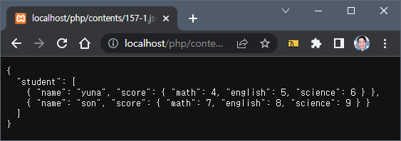 file_get_contents() 함수를 사용하여 앞에서 저장한 [157-1.json] 파일의 데이터를 불러와 보도록 하자.