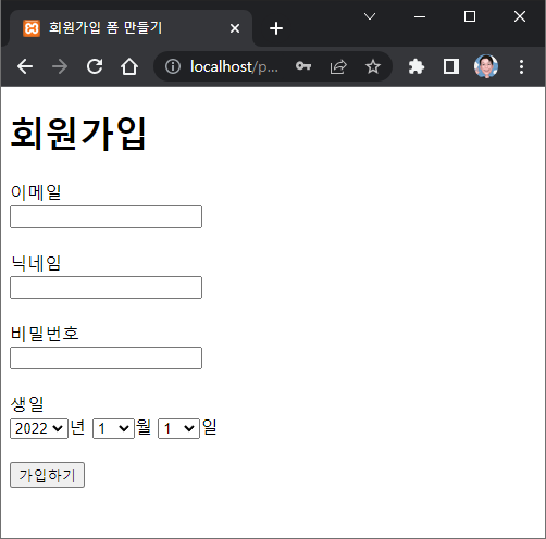 실행 URL은 http://localhost/php/joinLogin/signUp/173_signUoForm.php 이다.