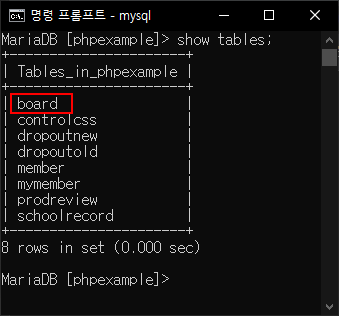 터미널이나 phpMyAdmin에 접속하여 생성된 테이블의 목록을 확인할 수 있다.
