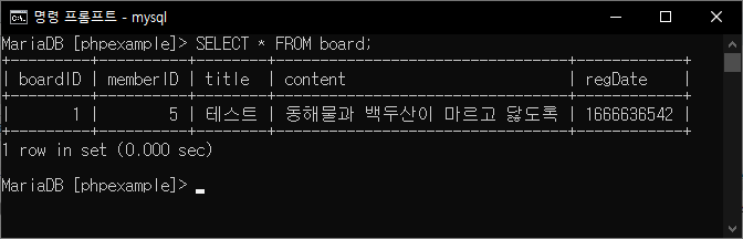 터미널 또는 phpMyAdmin을 통해 board 테이블의 내용을 확인해보자.