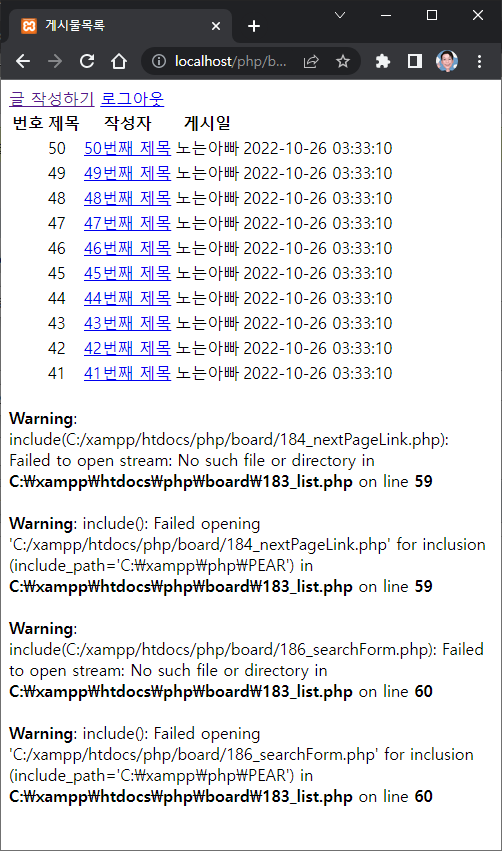184_nextPageLink.php 와 186_searchForm.php 파일은 아직 만들지 않았기 때문에 에러가 표시된다.