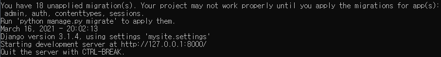 mysite 디렉토리로 이동하여 다음의 명령어를 입력합니다.